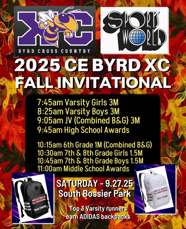 Cost: $130 per school for High School Varsity/JV (unlimited entries) and $130 for Middle School (unlimited entries). If less than 5 runners, its $15/runner. There will be a $5 spectator fee per car. Please make high school division checks payable to C.E. Byrd Cross Country. Please make middle school division checks payable to Caddo Middle Magnet.